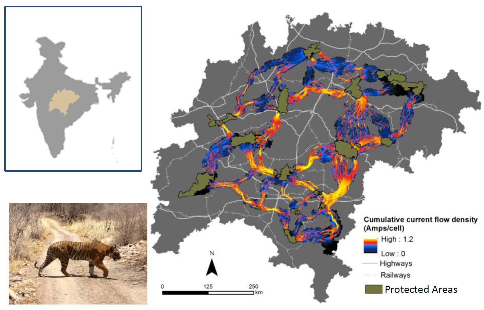 Dutta et al. (2015) combined Circuitscape with least-cost corridor methods to map pinch points within corridors connecting protected areas for tigers in central India. Areas with high current flow are most important for tiger movements and keeping the network connected.
