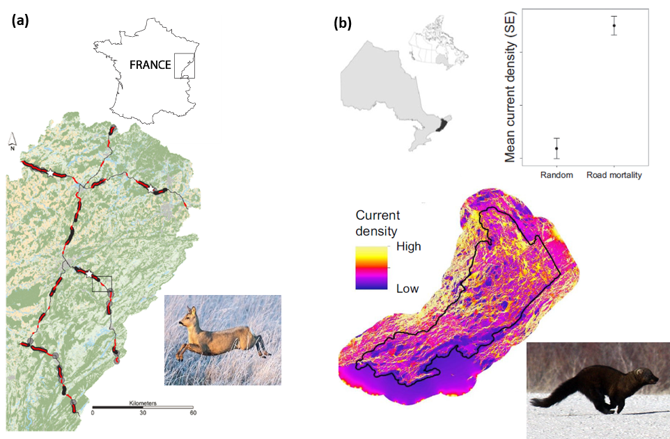 Circuit theory is being used to mitigate road impacts on wildlife and improve driver safety in at least six countries. (a) Circuit theory (implemented using Graphab) outperformed other connectivity models for predicting vehicle collisions with roe deer in France (Girardet et al. 2015). (b) A wall-to-wall connectivity map created using Circuitscape was highly correlated with road mortality for amphibians and reptiles and habitat use by fishers in eastern Ontario, Canada (from Koen et al. 2014). Similar methods are now being used across Ontario and in many other parts of Canada.